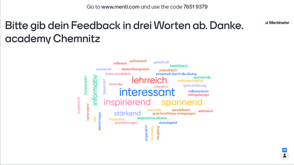 Es war eine geniale Veranstaltung, sehr gut strukturiert und auch so breit gefächert, dass unterschiedliche Aspekte als „Begleiter“ mit dabei waren – wie etwa Zivilcourage. Sehr gute Atmosphäre, so wertschätzend und offen, es ist gelungen, einen Safe Space zu schaffen. DAnke dafür, danke an Serpil und die Gruppe.